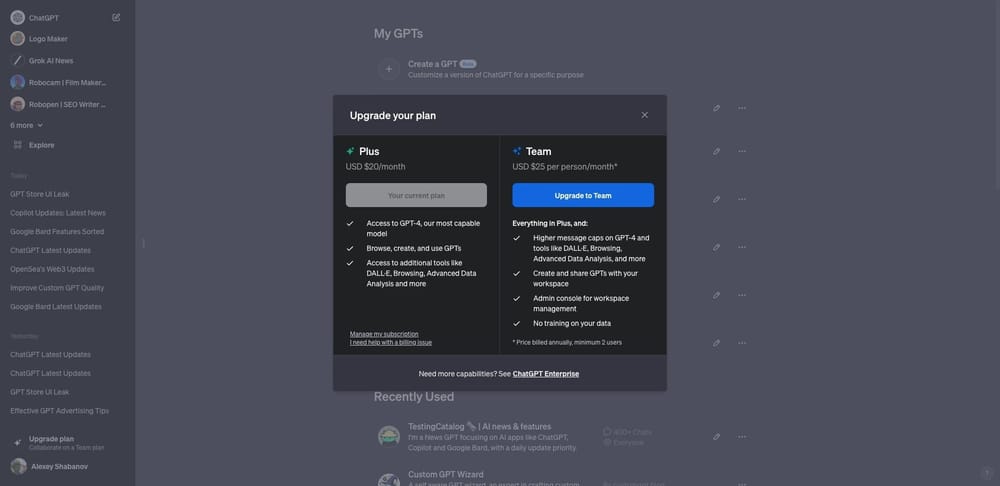 כמו כן, הוצגה בעדכון תוכנית צוות, במחיר של כ-$25 לחודש עבור מינימום של שני משתמשים, מחויבת מדי שנה. תוכנית זו, המיועדת לארגונים, כוללת תכונות כמו מכסת הודעות מוגברת, היכולת ליצור ולשתף GPTs בתוך סביבת עבודה, מסוף ניהול והדרכה מושבתת כברירת מחדל, תוך התמקדות בטיפול מאובטח בנתונים ויצירת GPTs מותאמים אישית.