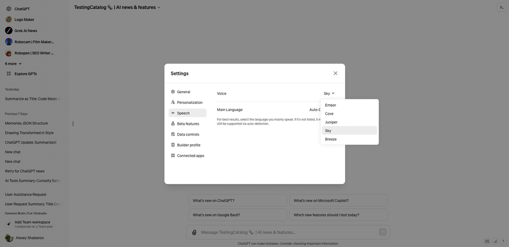 OpenAI עובד על תכונת שליטה קולית עבור גרסת האינטרנט ChatGPT. הגדרת דיבור חדשה זוהתה בפיתוח המאפשרת לבחור קול ושפה, באופן דומה לאופן שבו היא מופיעה בנייד. אפשרות הקלט הקולי עצמה עדיין לא שם ולכן לא ניתן לבדוק עדיין ולא ברור אם מצב שיחה יגיע יחד עם התכונה הזו לאחר מכן. בנוסף, OpenAI שיכללה את פרופיל ה-Builder עם שינויים קלים בממשק המשתמש ונראה שהשילוב של LinkedIn עובד כעת (בבדיקות פנימיות).