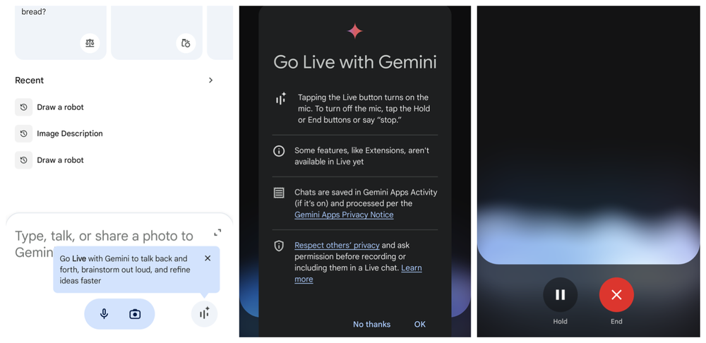 לאחר בחירת קול, עליך להסכים לתנאים ולהגבלות, ואז הממשק הקולי הופך לנגיש. זה מתפקד באופן דומה למצב הקול הסטנדרטי של ChatGPT, אבל עם כמה הבדלים. לדוגמה, Gemini מאפשר לך להפריע לתגובות, שזה חלק מהמצב המתקדם שלה - תכונה ייחודית. אתה יכול גם להפריע באמצעות כפתור, ולמרות שזמן התגובה לא תמיד מיידי, התכונה יעילה בדרך כלל.