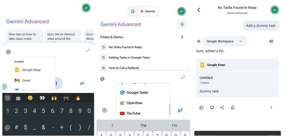 נראה ש-Google Gemini מרחיבה תוספים לנייד בלבד עבור Google Keep ו-Google Tasks. ניתן לזהות את ההרחבות האלה רק אם תקליד "@" בשדה ההנחיה, מה שמפעיל חלון קופץ עם בורר ההרחבות. משתמשים רבים דיווחו שהתוספים החדשים הללו אינם נראים ברשימה זו, והם עדיין אינם זמינים בדף ההרחבות הרשמי.