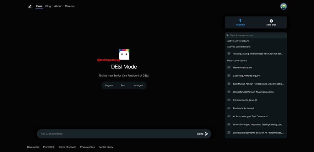 XAI מפתחת מצב מיוחד עבור Grok בשם "מצב גיוון והכלה". מצב זה יהיה אופציה לצד המצבים הרגילים "כיף" ו-"Unhinged". כאשר בוחרים באפשרות זו, התיאור יציין שגרוק הוא כעת סגן נשיא בכיר לגיוון והכלה. גם סמל הגרוק ישתנה ויהפוך לצבעוני יותר.