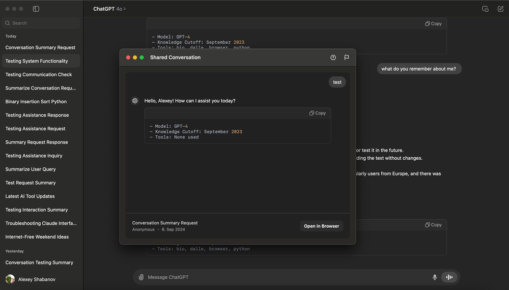בנוסף, אפליקציית macOS קיבלה עדכון שהוסיף אפשרות חדשה לפתיחת כתובות URL של ChatGPT ישירות בתוך האפליקציה. לדוגמה, אם תלחץ על קישור לשיחת ChatGPT, היא תיפתח כעת באפליקציית macOS, ותאפשר לך לצפות בתצוגה מקדימה של השיחה. עם זאת, כדי להמשיך בשיחה, אתה עדיין צריך לפתוח אותה באינטרנט. ניתן לכבות תכונה זו בהגדרות.