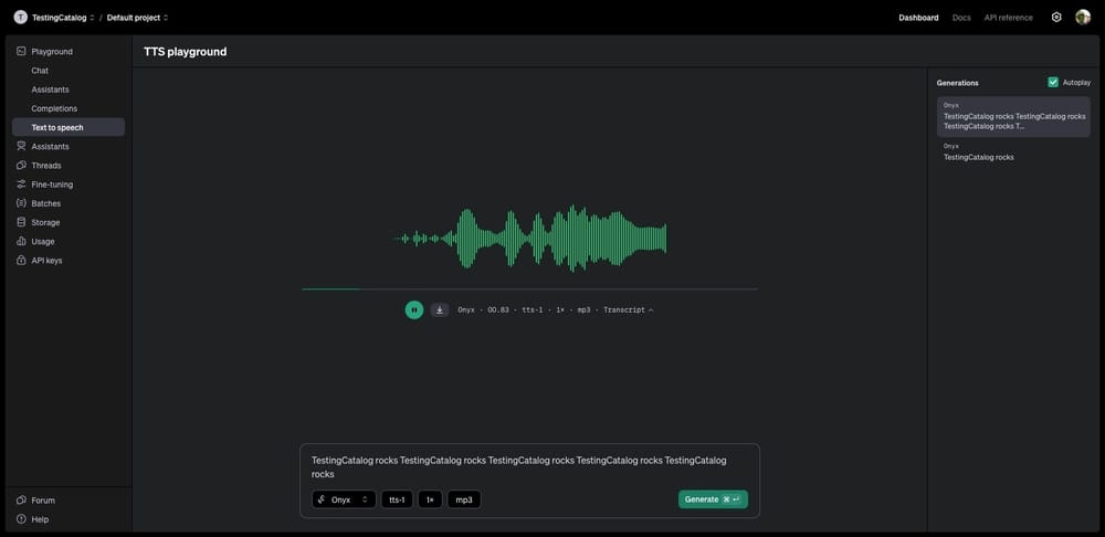 - קלות שימוש: משתמשים יכולים פשוט להזין הודעה לממשק Playground כדי ליצור אודיו, ולבטל את הצורך בהגדרה או קידוד מורכבים.