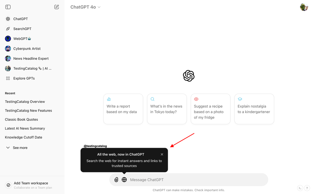 OpenAI ממשיכה לחדד את רמזי המערכת שלה, במיוחד עבור פונקציונליות החיפוש. ניסויים אחרונים כוללים הוספת לחצן חיפוש בולט יותר לשדה קלט הטקסט של ChatGPT. בחירה בכפתור זה פותחת ווידג'ט חדש, המציין שההנחיה הבאה תשתמש בתכונת החיפוש הכפוי. למרות שזה דומה לרמז המערכת הקיים שמשתמש בפקודת נטוי, הוא מציג ממשק משתמש חדש ומבוא מוקפץ. זה נעשה ככל הנראה כדי לקדם את התכונה בקרב משתמשים.